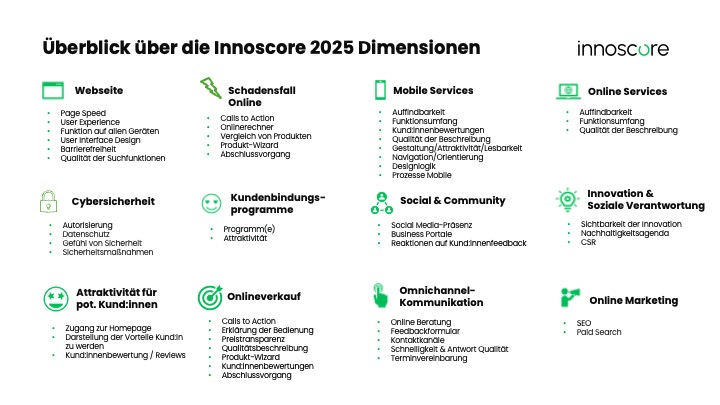Der Innoscore analysiert objektiv den digitalen Reifegrad von Versicherern auf Basis öffentlich zugänglicher Daten, ohne interne Befragungen. 2025 wurden von Mai bis September 94 Versicherer in Europa und Nordamerika bewertet. Drei Analysten evaluierten jedes Unternehmen anhand von 480 Kriterien in 11 Dimensionen. Die diesjährige Methodik legte einen neuen Schwerpunkt auf smarte Assistenzsysteme (z. B. Wizards) und die Qualität mobiler Services.