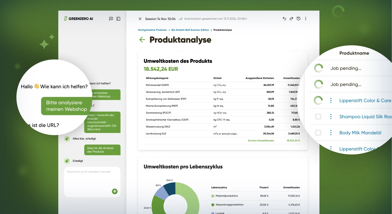 Die Vision von GREENZERO war, Nachhaltigkeit für Unternehmen nicht nur erfassbar, sondern auch handhabbar zu machen. Dazu sollten sämtliche Umweltwirkungen – weit über CO₂ hinaus – automatisiert erfasst, bewertet und visualisiert werden. Ziel war ein System, das komplexe wissenschaftliche Berechnungen in intuitive, handlungsrelevante Informationen übersetzt und zugleich eine flexible, KI-gestützte Interaktion ermöglicht.