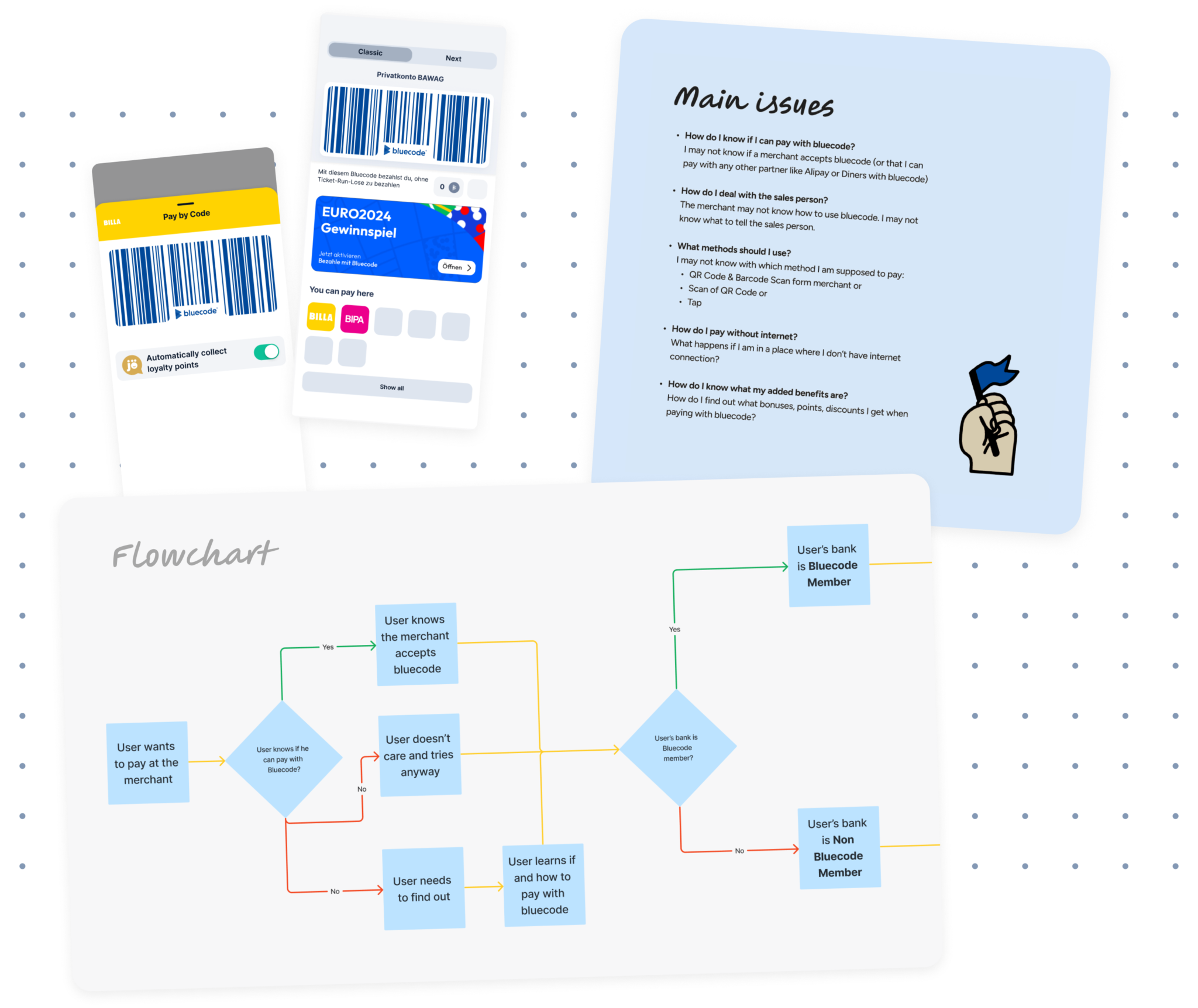 At the beginning of the discovery phase, we analyzed existing focus groups and user interviews to identify current challenges and problems with the Bluecode app.